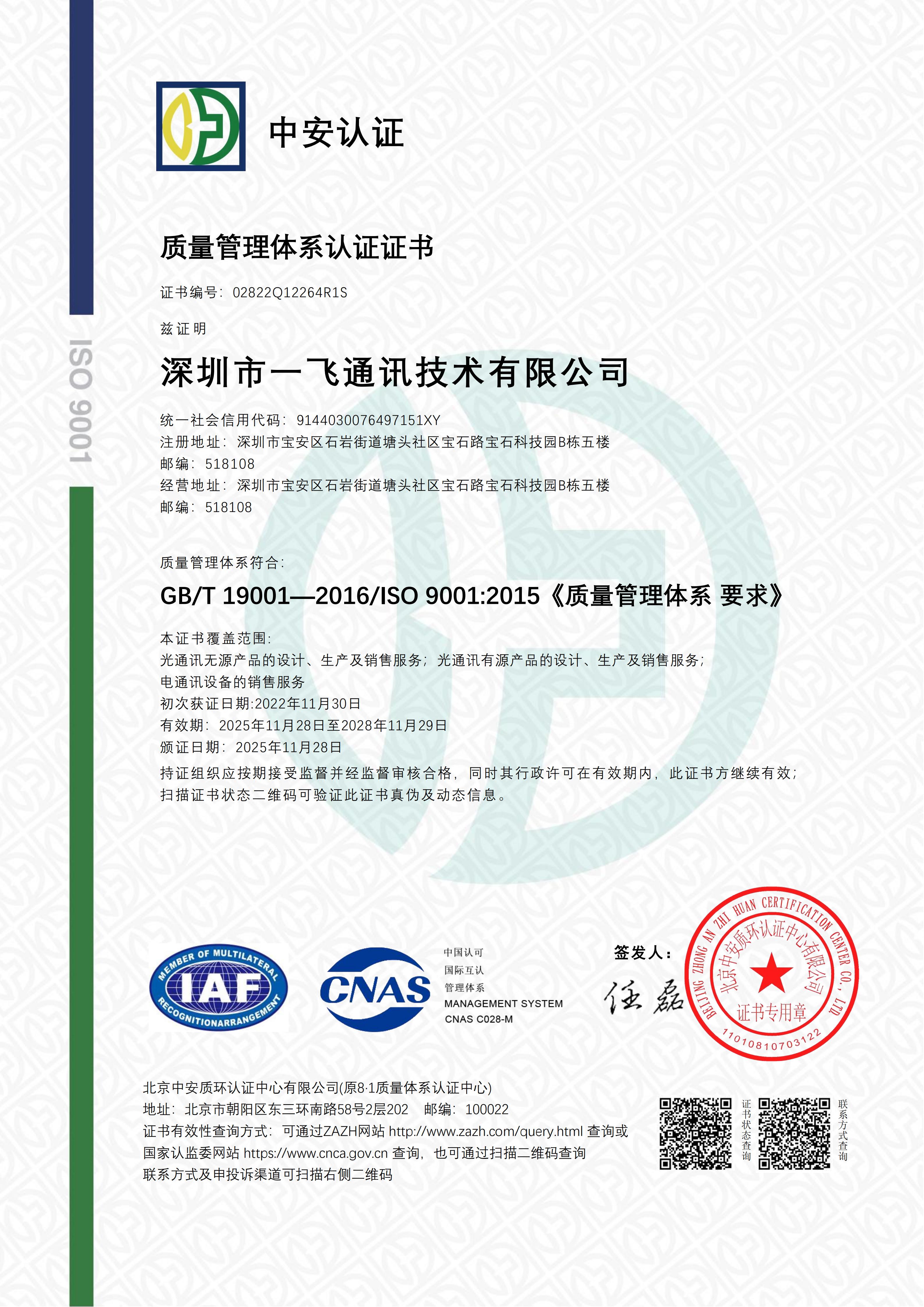 一飞通讯(E-PHOTICS)成立于2004年7月,是一家专业从事光通信器件的研发、生产和销售的国家高新技术企业。主要产品包括纳秒级高速电光开关、高速磁光开关、高功率保偏磁光开关、马达光开关、MEMS光开关、机械光开关、光开关模块等光开关系列,光纤连接器、光纤跳线、光纤熔接保护管等。